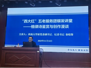 发布时间: 2025-11-18 16:11:51 已阅读:为提升学生的美育素养,使学生深入了解中华优秀传统文化历经千年传承的脉络,11月14日下午,由离退休党委 离退休工作处主办、国家治理学院承办的“前辈的火炬”师生主题交流活动之“格律诗鉴赏与创造漫谈”讲座,在西南大学教职工活动中心二楼报告厅举办。讲座由西南大学原党委副书记、纪委书记徐晓黎主讲,学院2025级本科生与研究生共同参与,学院党委书记刘勇主持讲座。