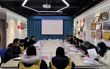 发布时间: 2025-12-15 09:22:28 已阅读:为全面掌握联合培养基地的实习培养质量与条件保障情况,促进西南大学社会工作硕士专业学位研究生实践教学需要与合作单位实际需求间的紧密结合,2025年12月10日下午,西南大学研究生教育指导专家委员会委员李庆、陈建华、赵秀兰,西南大学研究生教育质量督导工作组专家王华、苏胜齐、陈小娟,西南大学研究生院质量监督与信息科张琳雅,国家治理学院副院长(主持工作)郭美云,社会工作硕士专业学位研究生教育管理中心副主任马震越一行赴重庆市九龙坡区九龙社会工作服务中心进行专业学位研究生联合培养基地督导调研交流。重庆市九龙坡区九龙街道党工委宣传、统战委员陈双珊,街道相关科室领导,九龙社会工作服务中心党支部书记、主任陈会兰和国家治理学院社会工作专业学位研究生实习生参与本次活动。