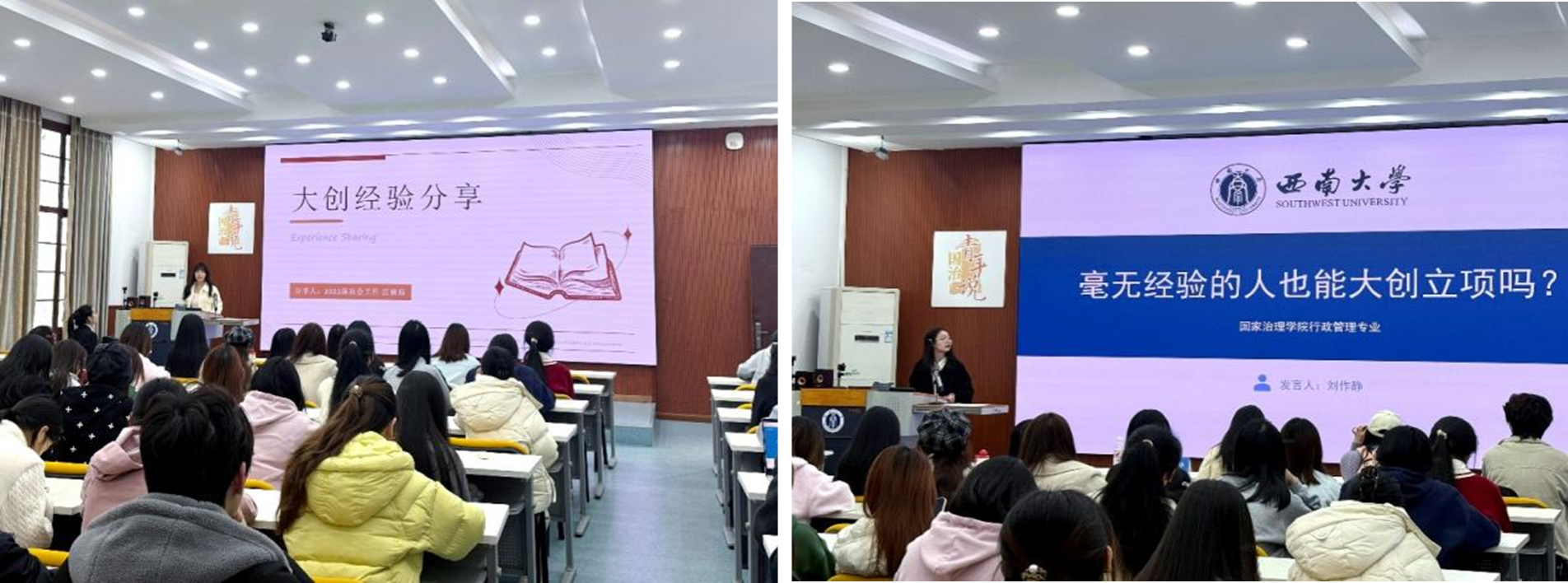 发布时间: 2026-03-24 15:47:59 已阅读:为提升学生科研创新与实践能力,助力大学生创新创业训练计划项目高质量开展,2026年3月20日下午,学院在3教3308举办“青创领航 共启未来”大创经验分享会暨“国治青年说”第四期活动。活动邀请汪桢雨、刘作静两位优秀学子分享经验,吸引2024级、2025级众多同学踊跃参与。