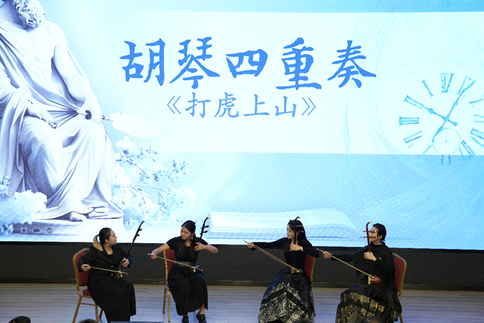 随后,来自音乐学院和国家治理学院的师生带来了精彩的哲学舞台表演:音乐学院彭薪竹等同学的胡琴四重奏《打虎上山》用琴声引领我们勇闯思想的“威虎山”;国家治理学院哲学系李兆洋等同学自编自导的话剧表演《戈多,我们还在等你》在精彩演绎中让我们感受一种向上的力量;音乐学院教师玛尔健的独唱《春天的芭蕾》如春天般蓬勃的歌声为我们注入了无限的活力;国家治理学院文化产业管理系夏雪、行政管理系马可珈同学带来的舞蹈《不如见一面》是活力之后的一份深情地凝望;音乐学院刘欣阳、李明鑫同学的歌曲《灯火里的中国》表达了深厚的家国情怀,以灿烂灯火照耀哲学道路。