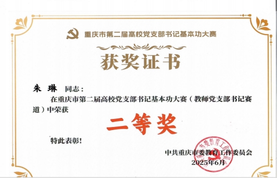 上半年,市委教育工委举办第二届高校党支部书记基本功大赛。经学校层层选拔,学院公共政策宣讲团党支部书记朱琳同志脱颖而出,作为西南大学代表出征市级赛场。面对来自全市各高校的优秀选手,朱琳同志沉着应战、从容发挥,凭借生动的党建实践案例和过硬的综合素质,赢得评委一致认可,荣获教师党支部书记赛道二等奖。