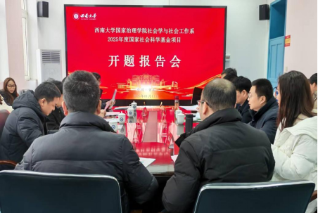 发布时间: 2026-01-12 16:44:54 已阅读:2026年1月11日下午,西南大学国家治理学院社会学与社会工作系2025年度国家社会科学基金项目开题报告会在学院17教205会议室隆重举行。本次报告会由重庆市社会科学界联合会党组成员、副主席唐旺虎、重庆师范大学党委副书记周学馨、西南大学二级教授王志章、社会科学处处长罗超平、副研究员吕刚武、国家治理学院党委书记刘勇、院长郭美云、副院长何健等多位专家组成评议组。郭美云主持本次会议。