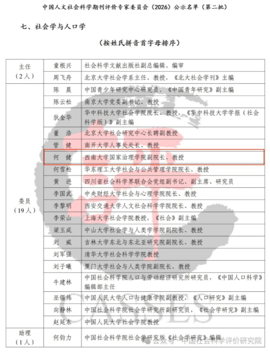 近日,中国社会科学评价研究院正式公示“中国人文社会科学期刊评价专家委员会(2026)”第二批名单。我院何健教授当选社会学与人口学专家委员会第二届委员。