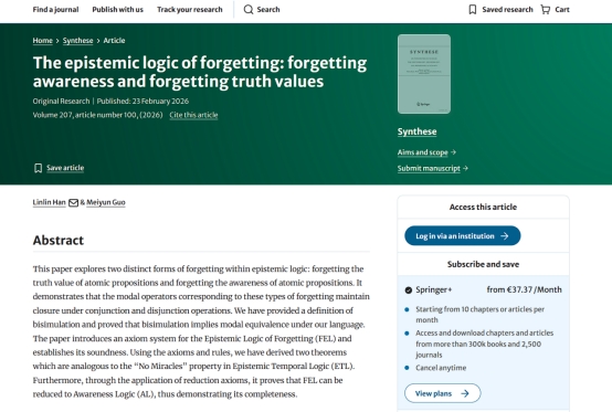 发布时间: 2026-02-27 15:29:06 已阅读:近日,我院哲学系郭美云教授与其博士生韩琳琳共同撰写的The epistemic logic of forgetting: forgetting awareness and forgetting truth values(关于遗忘的认知逻辑:遗忘觉知和遗忘真值)一文发表于中科院期刊分区人文学科哲学大类分区二区Top期刊Synthese。文章探讨了认知逻辑中两种不同的遗忘形式:遗忘原子命题的真值以及遗忘原子命题的觉知。文中表明,与这两种遗忘类型相对应的模态算子在合取和析取运算下保持封闭性。文中给出了互模拟的定义,并证明了在该语言下互模拟蕴含模态等价。该文给出了遗忘认知逻辑(FEL)的公理系统,并证明了其可靠性。利用这些公理和规则,得到了两个类似于时态认知逻辑(ETL)中“无奇迹”性质的定理。此外,通过应用归约公理,证明了FEL可归约到觉知逻辑(AL),从而证明了其完全性。