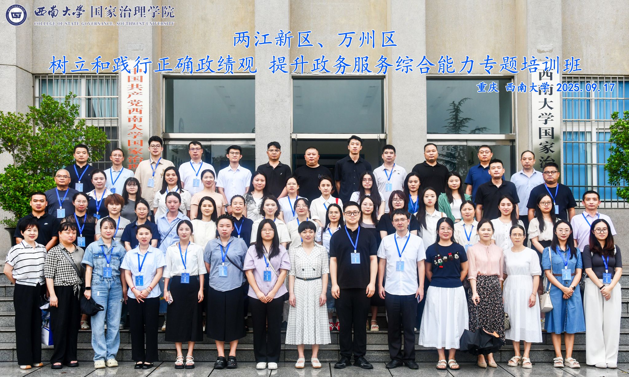 发布时间: 2025-11-14 09:37:58 已阅读:2025年9月16日,树立和践行正确政绩观 提升政务服务综合能力专题培训班在西南大学国家治理学院顺利开班,共43名学员参与。