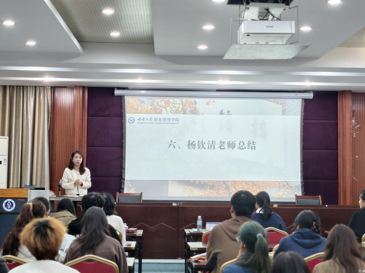 随后,培训会进入经验分享环节,优秀学生代表与班委年级骨干代表依次交流学生工作经验与体会。2023级社会工作专业学生周怡羽从底图、配色、字体和组件四个维度讲解PPT制作技巧,2023级行政管理专业罗瑞麒结合学生工作实践,围绕班级管理、团队协作及学业与工作平衡等方面分享学生工作经验,吴英以“真心、匠心、进取心”为核心,分享班委服务初心、务实履职态度与追求进步理念,2025级公共管理2班班长李佳蔚围绕服务与协作,讲述践行班长职责的带班经验,2025级公共管理1班宣传文体委员刘宇飞从机位选择、构图、人物特写三方面讲解会议拍摄技巧,2025级年级长罗敏嘉以“游戏升级”为喻,分享学生工作中的规范流程、沟通技巧与思维方法,2025级楼栋长卢谣嘉结合担任西南大学橘园五舍楼栋长的经历,分享以温暖服务化解管理难题、促进共同成长的感悟。