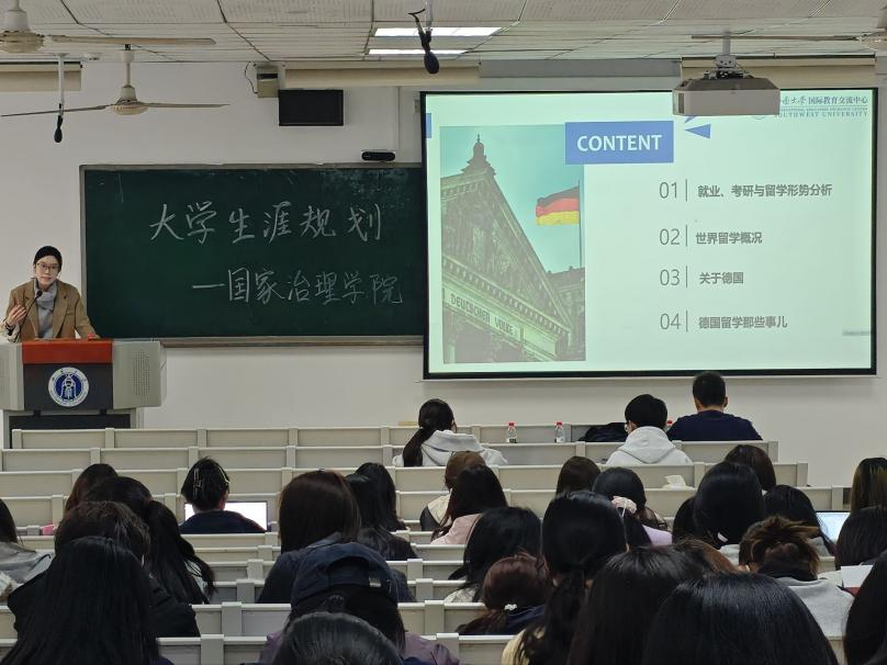 发布时间: 2026-03-23 14:16:16 已阅读:为深入落实立德树人根本任务,持续深化学院优良学风内涵建设,引导大一新生科学规划学业发展、明晰未来成长方向,3月13日下午,学院在十教501教室举办大学生涯规划专题讲座。本次讲座特邀国际教育交流中心刘老师、冉老师担任主讲,为同学们系统解析升学路径。讲座由2025级辅导员杨钦清老师主持。